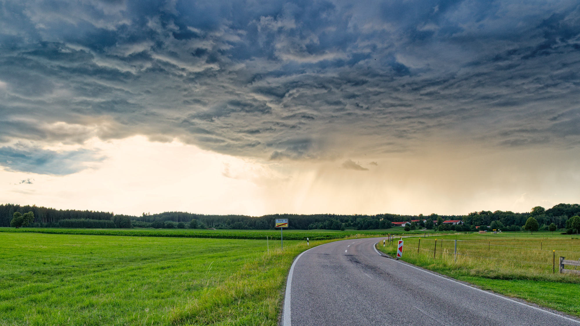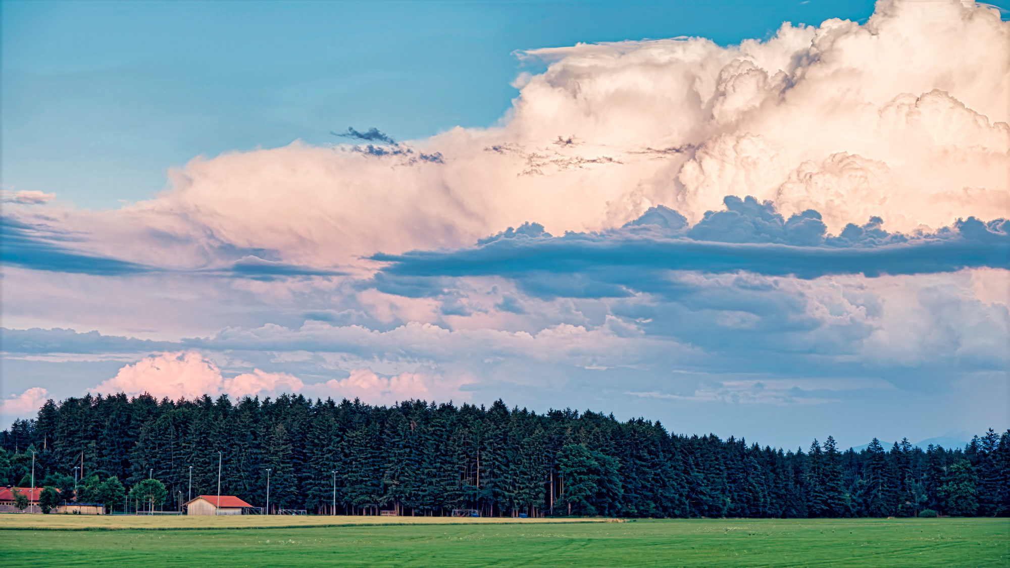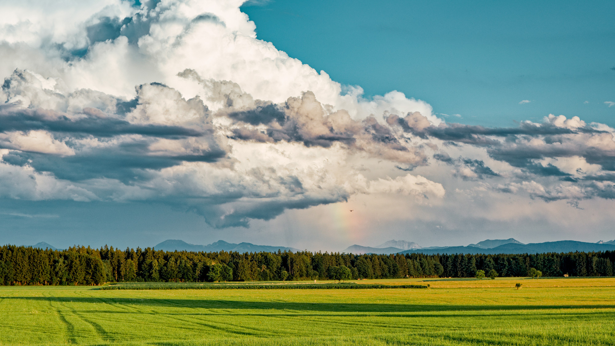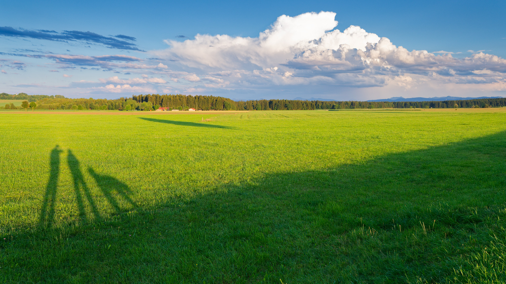 After dinner we took a along a road across the field to let Cooper stretch his legs after a whole day in the backseat of the car. The light was beautiful and the setting sun made long shadows over the green fields. The thunderheads that brought the sudden shower had moved on towards the mountains making for some spectacular skies and a partial rainbow in the distance. Cooper spotted a cat chasing field mice and got so excited he started walking upright.