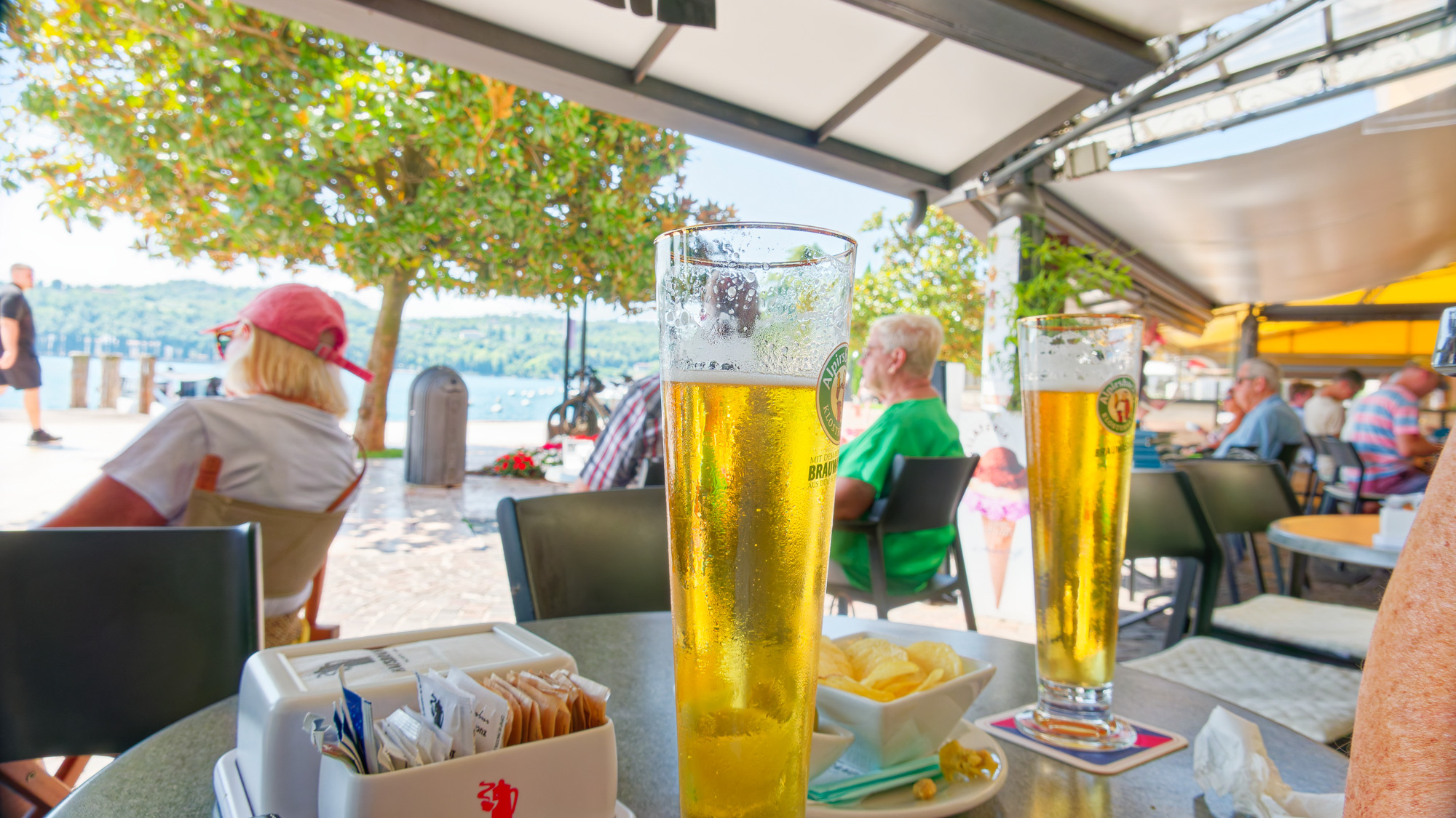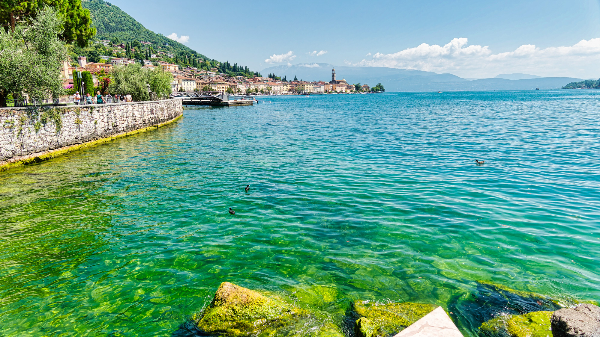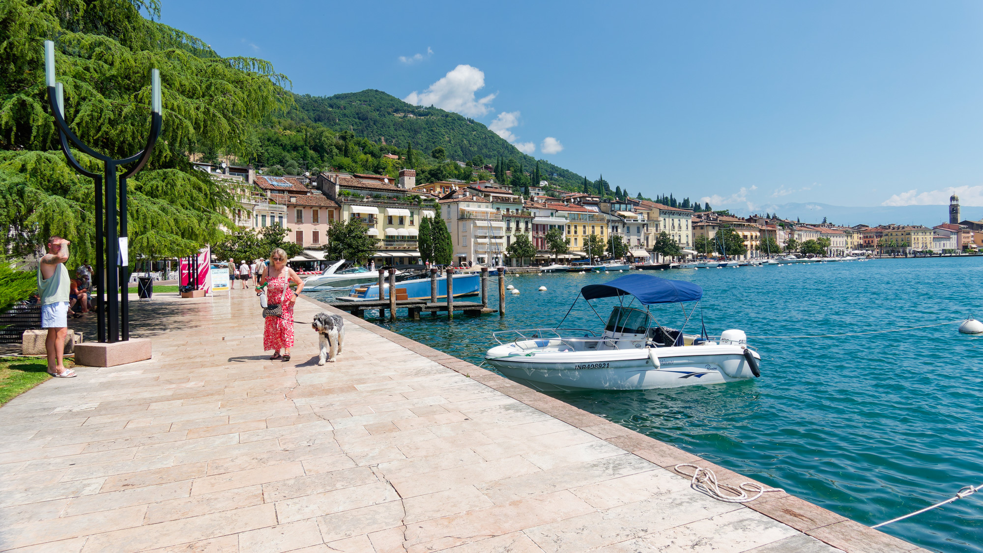 First we have to go back down the serpentine road to Limone Sul Garda and turn right. It’s a steep downhill run for the most part and it charges batteries so that we have used 0 KWh/ 100 km when we get to the bottom. It’s tunnels for the most part to begin with. Traffic is pretty intense. We heard from friends that Salo would be a nice place to stop so we turn off, find a place to park, and walk down through the old town center and the lake promenade, full of restaurant and cafés. It’s pretty warm so we sit down in the shade and have a beer and watch people pass by. Tourists mainly. Flashy speed boats come and go. Wealthy people on holidays.