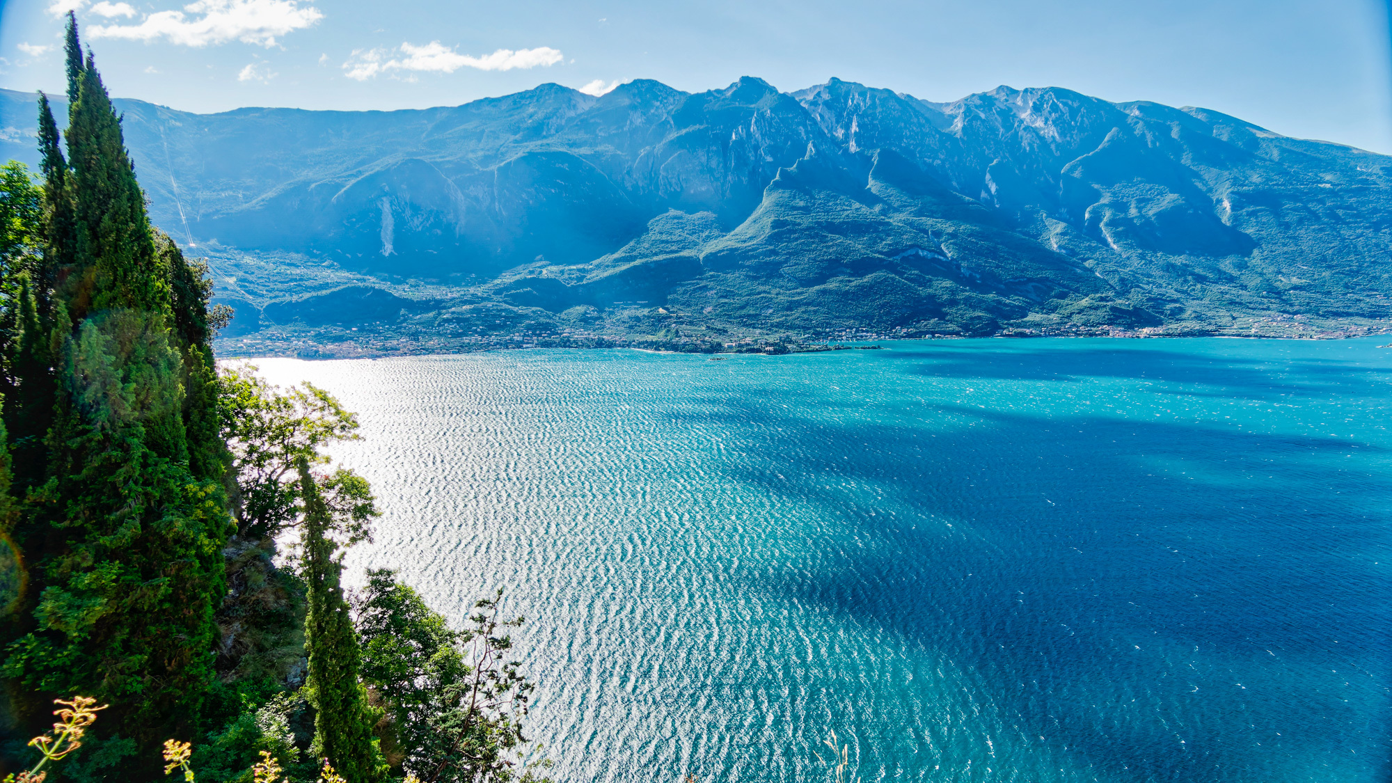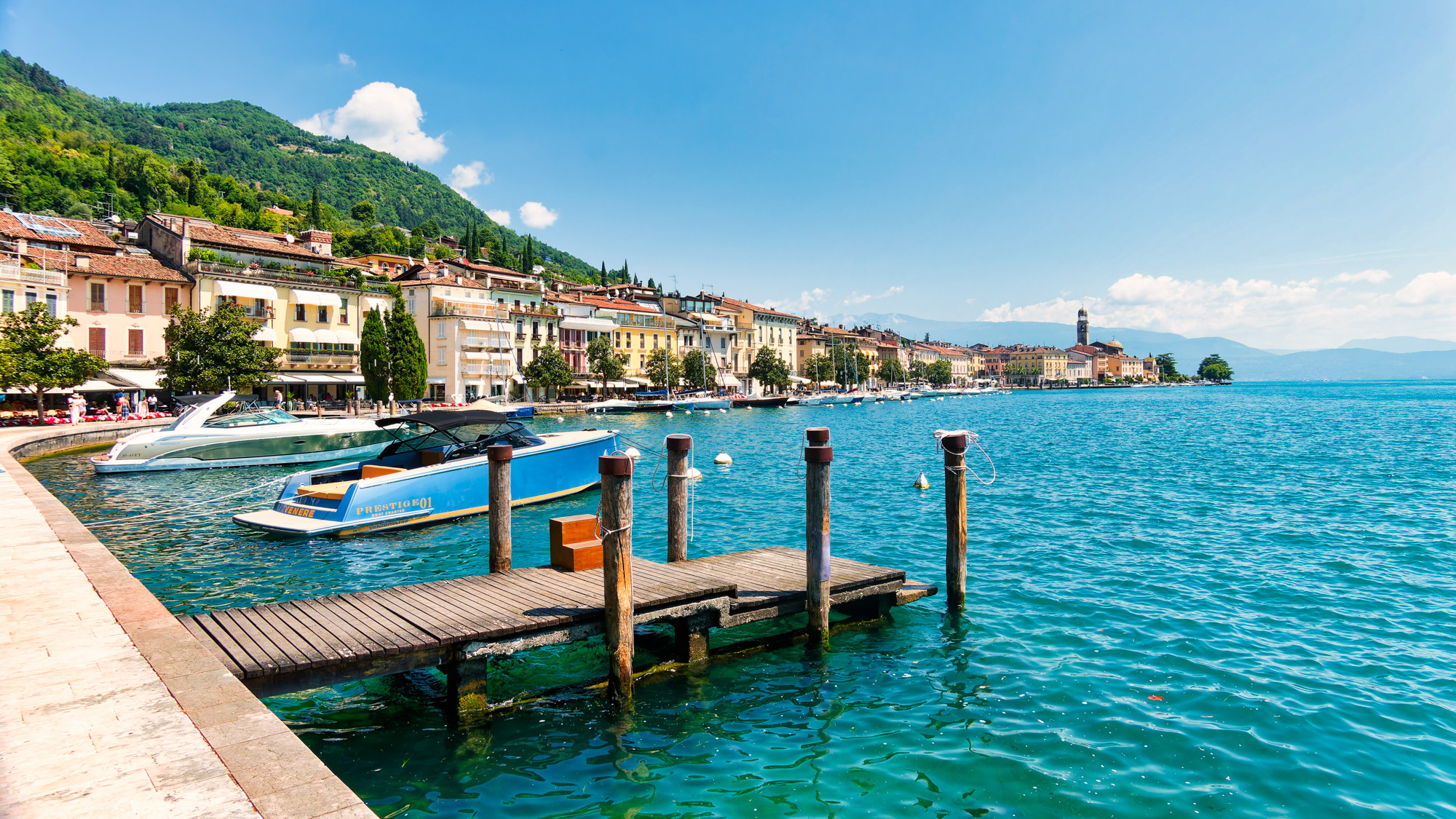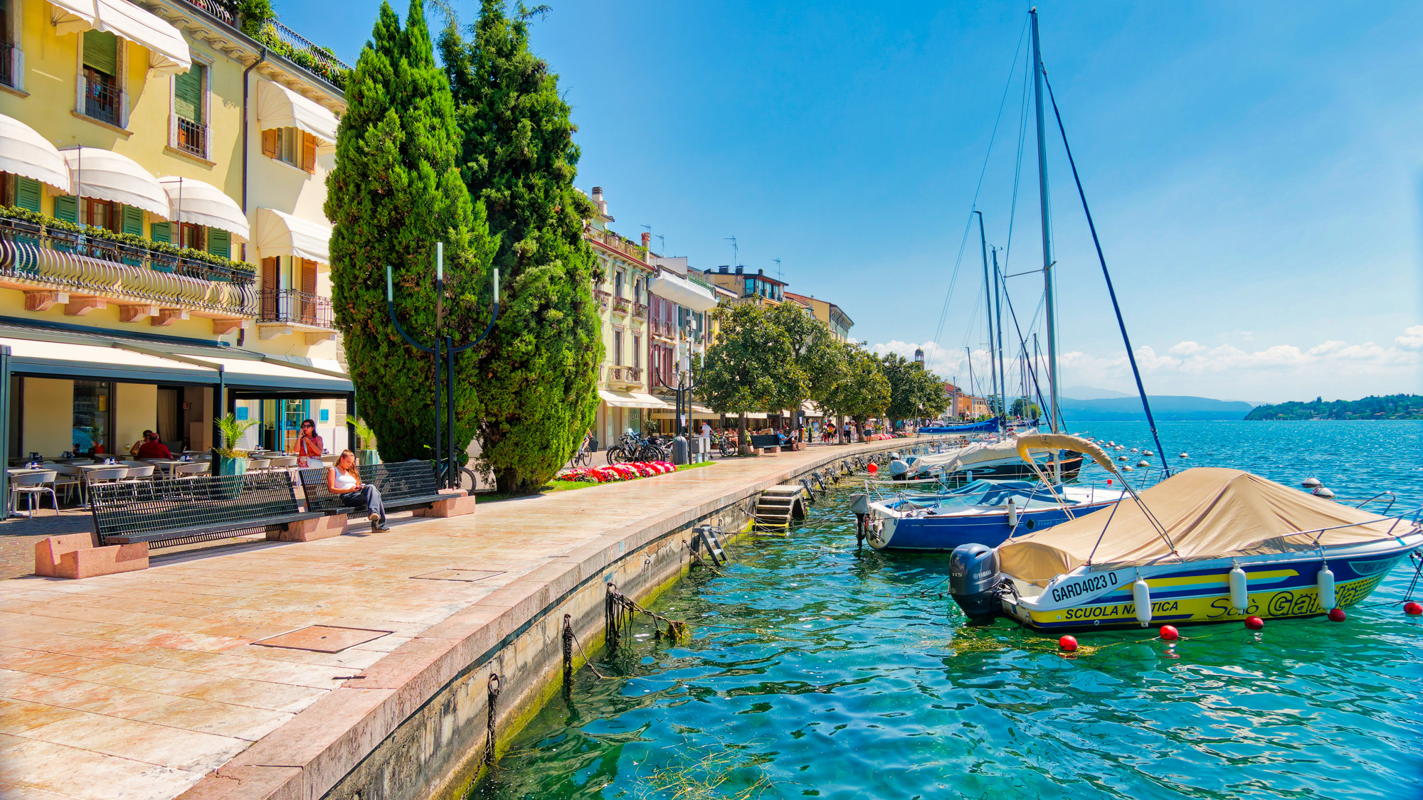 First we have to go back down the serpentine road to Limone Sul Garda and turn right. It’s a steep downhill run for the most part and it charges batteries so that we have used 0 KWh/ 100 km when we get to the bottom. It’s tunnels for the most part to begin with. Traffic is pretty intense. We heard from friends that Salo would be a nice place to stop so we turn off, find a place to park, and walk down through the old town center and the lake promenade, full of restaurant and cafés. It’s pretty warm so we sit down in the shade and have a beer and watch people pass by. Tourists mainly. Flashy speed boats come and go. Wealthy people on holidays.