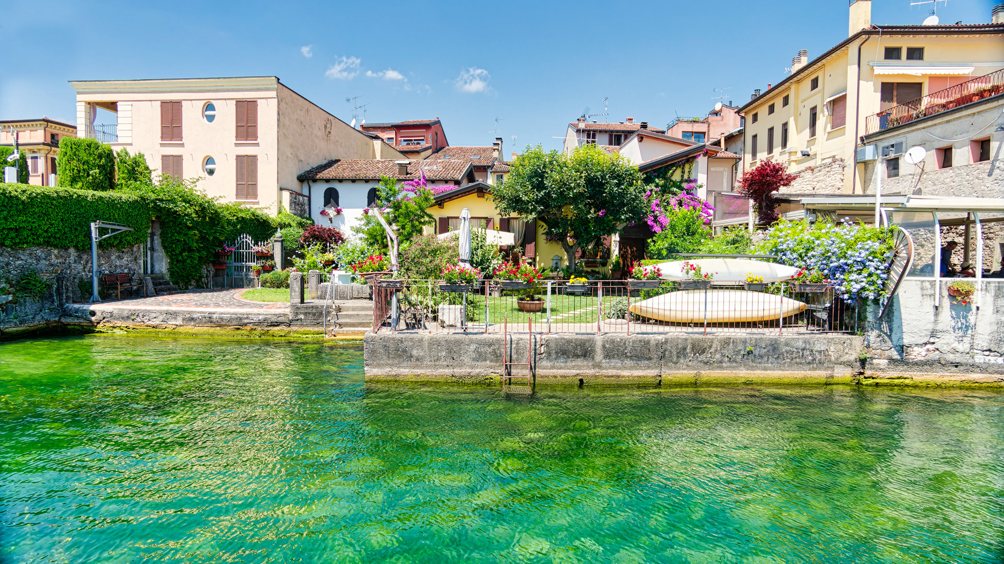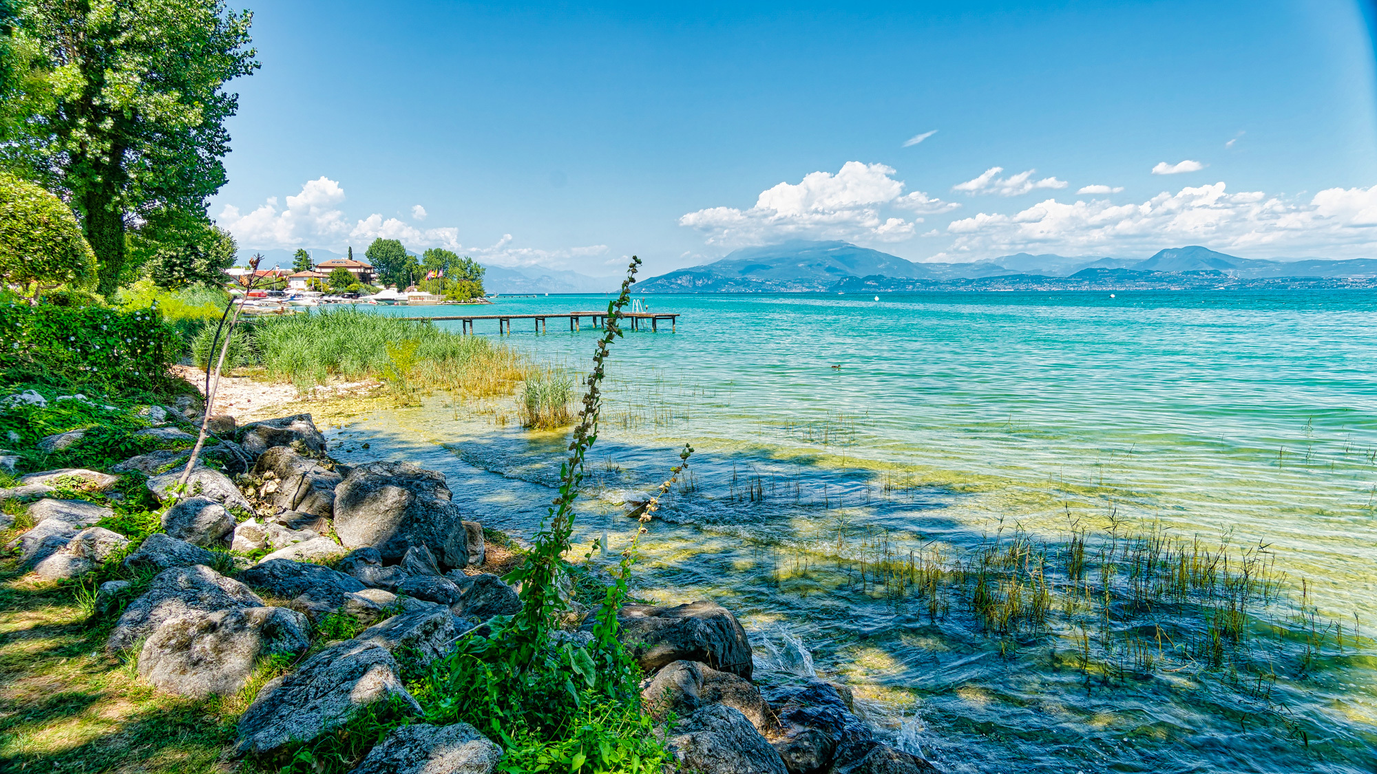 We walk back to the car and head for Sirmione, the narrow finger that protrudes into the lake from its southern end. Sirmione feels like it’s all tourism. It’s very beautiful but lacks the charm we had expected. Again, lots of traffic. We spot a place to park the car and take a walk along the shore line. The turquoise water, the green plants, and the hazy blue mountains in the background are almost to beautiful to be true. Lots of people wandering around. Can’t find a place to sit down and have a drink or a meal so we get back in the car and drive out to the end. Too many cars and too many people to really see anything.