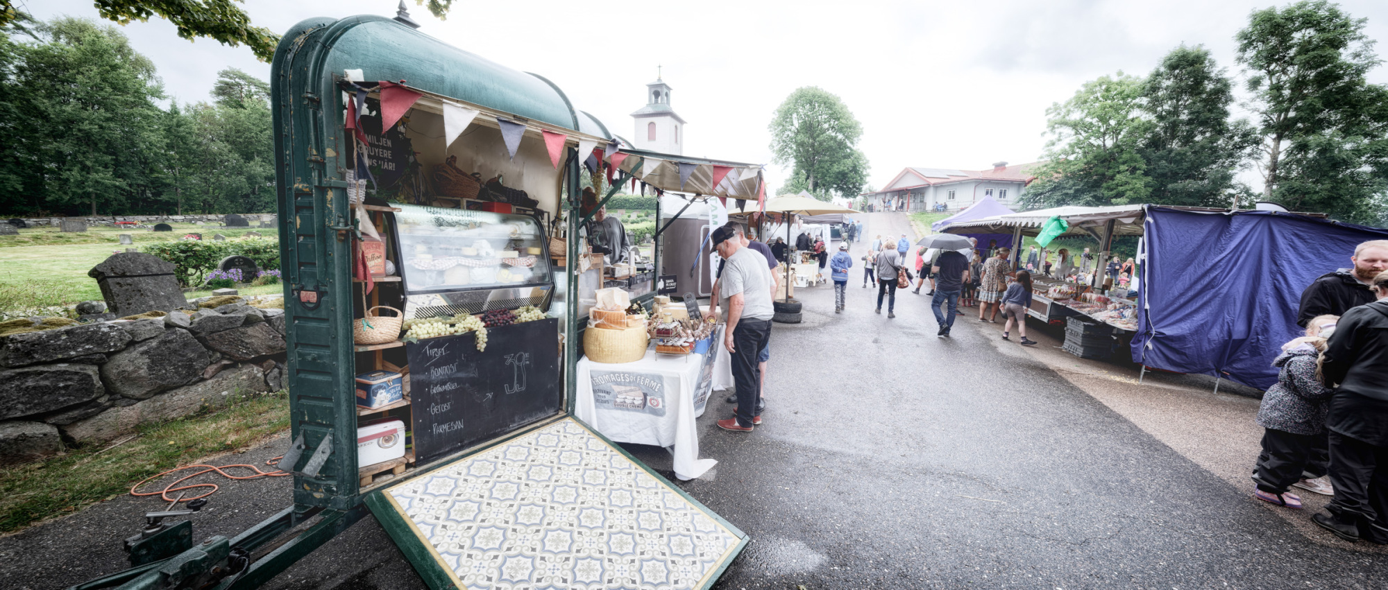Myckleby church is perched on a hill and the cemetery and access roads, where the cars are displayed and the local produce is on offer, slope steeply away from it. Makes for some interesting perspectives. The tractors are parked in a long row out in the field below. There are ignition ball engines (tändkulemotorer) thumping away and spitting out smoke rings while their proud owners, oil can in hand, keep them going and eagerly answer questions from curious passers-by.